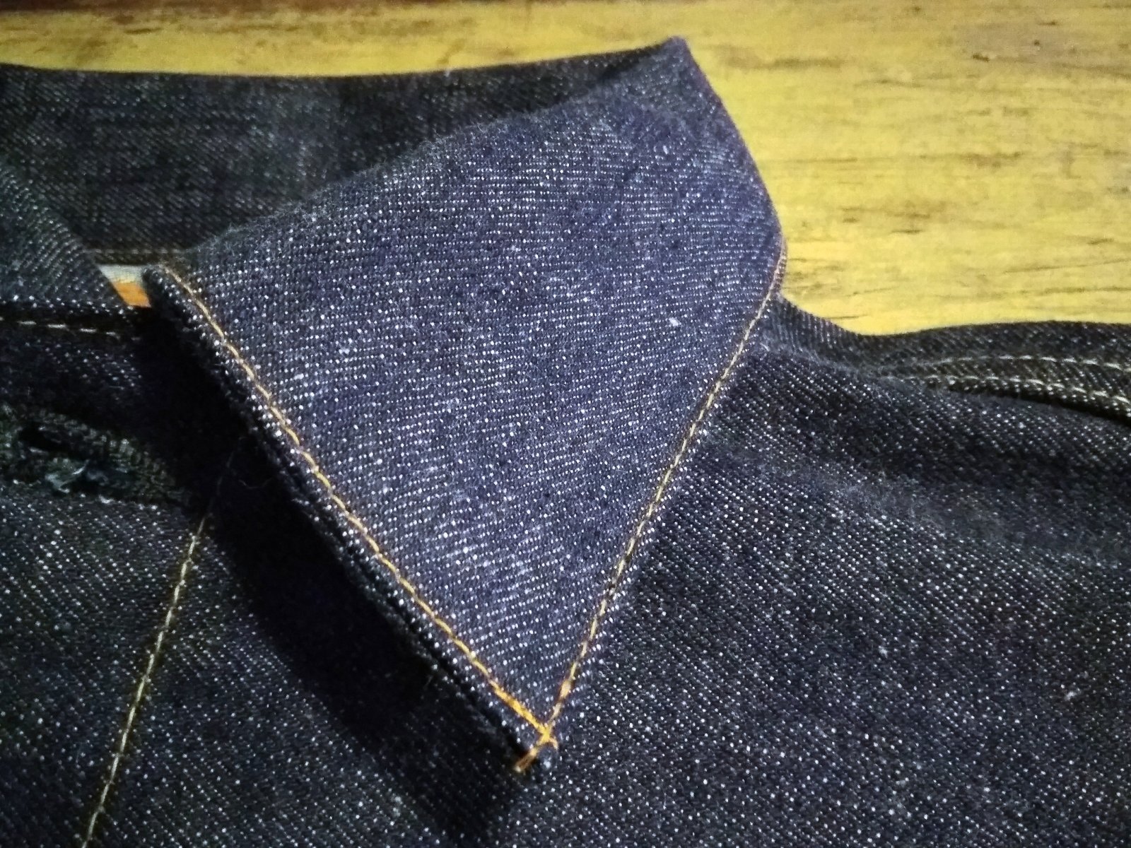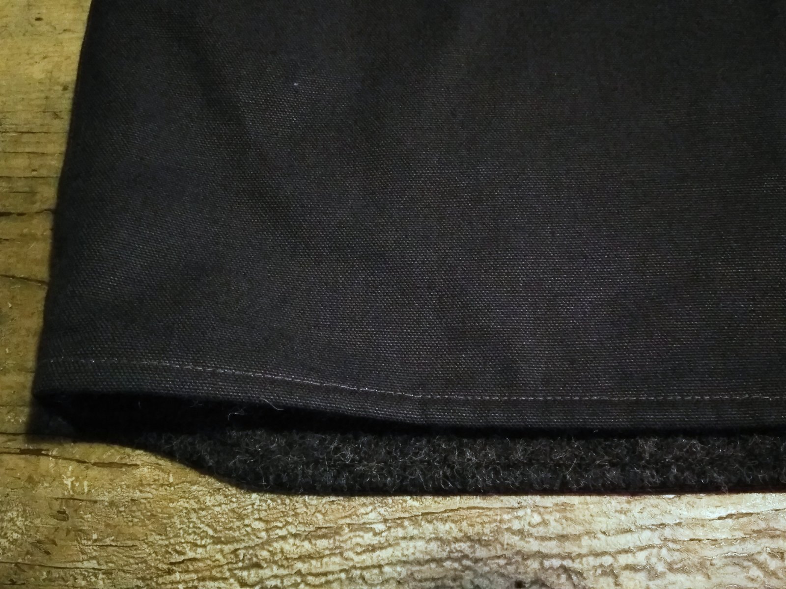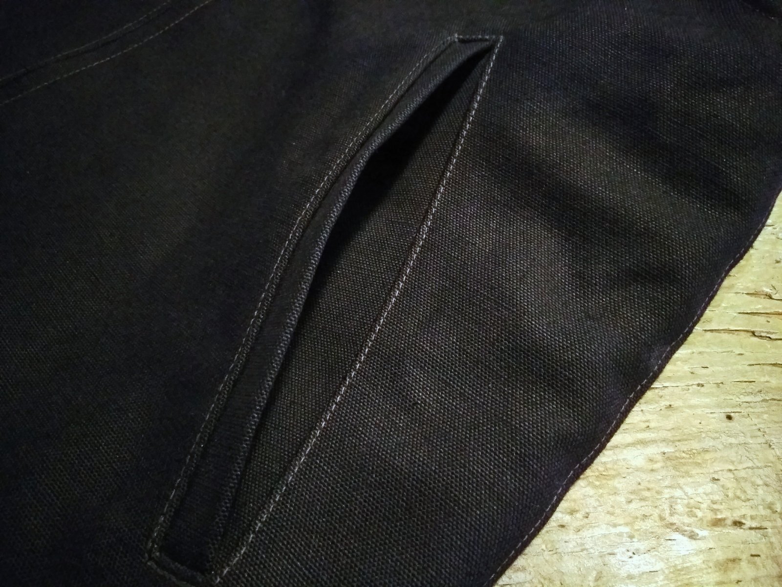 細かい仕様としてフロントのボタンホールや下部ポケットのスレーキをヘリンボーン生地で補強しています。