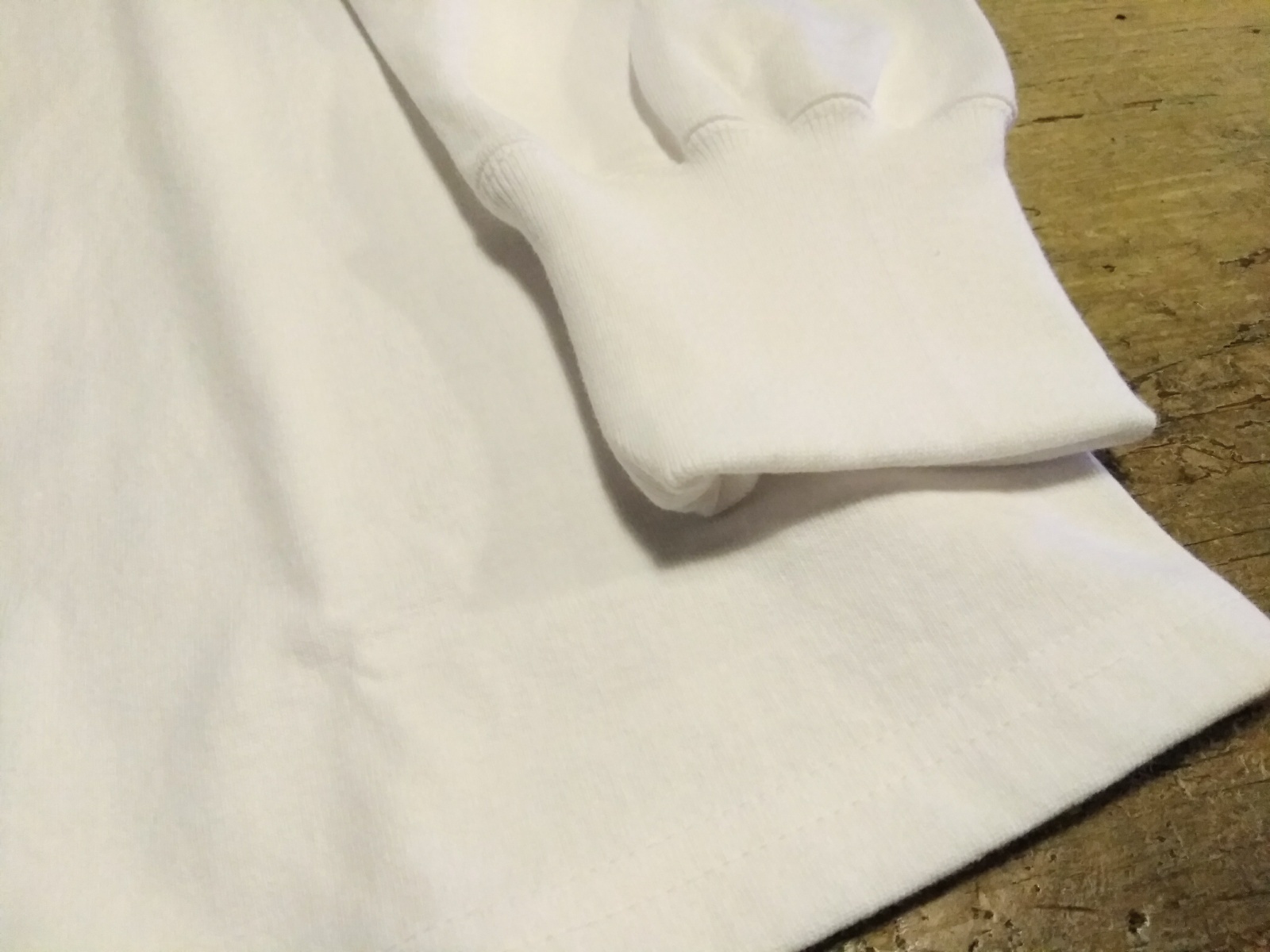 程良く厚みのある生地感で、首周り、袖口もガッシリとしており、ガシガシ着込んでも撚れや伸びが発生し難いです。