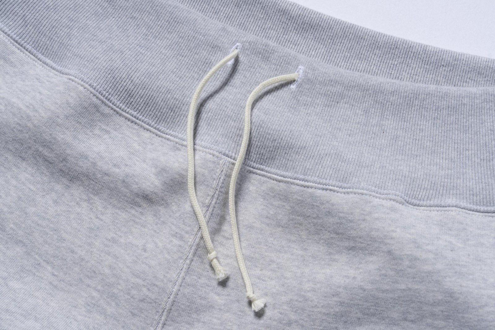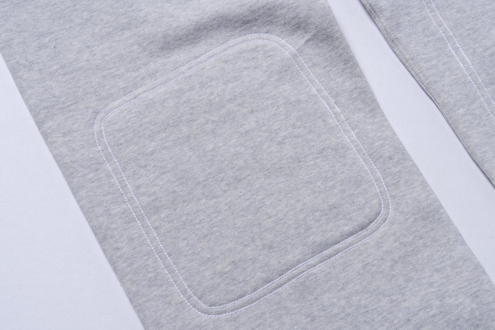 10オンスの吊り編み生地を使用し、膝の補強は生地を二重にして裏側から2本針のチェーンステッチで縫われている。